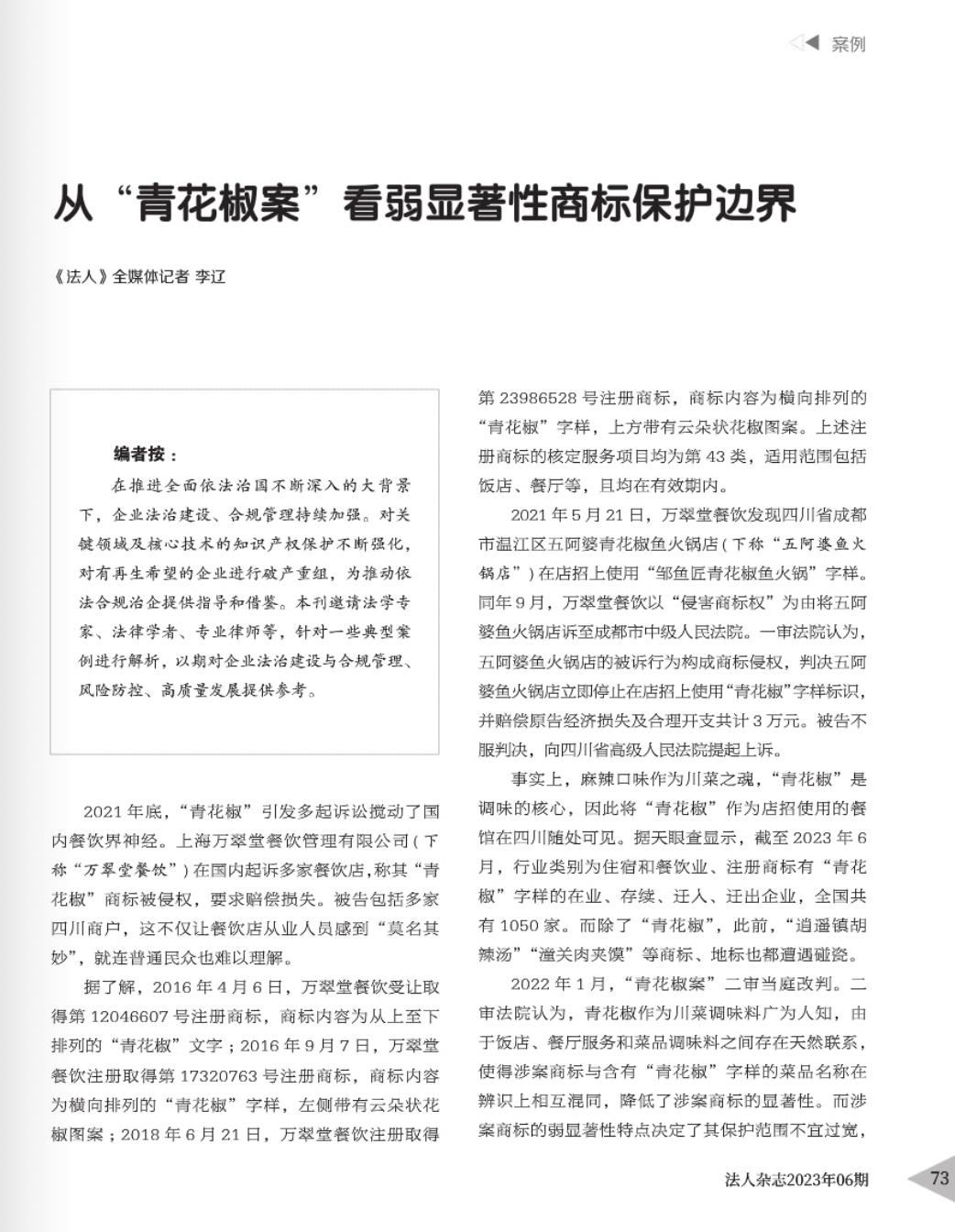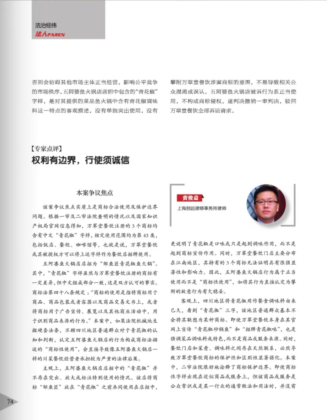 青岛辉知简讯 | 辉知队黄俊益律师应“法治日报”旗下杂志邀请,就“青花椒”案发表专家点评